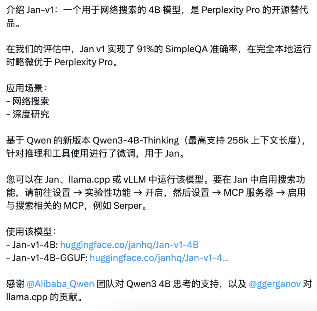 有趣,一款仅4B大小的开源模型Jan-v1,居然声称能平替Perplexity Pro。