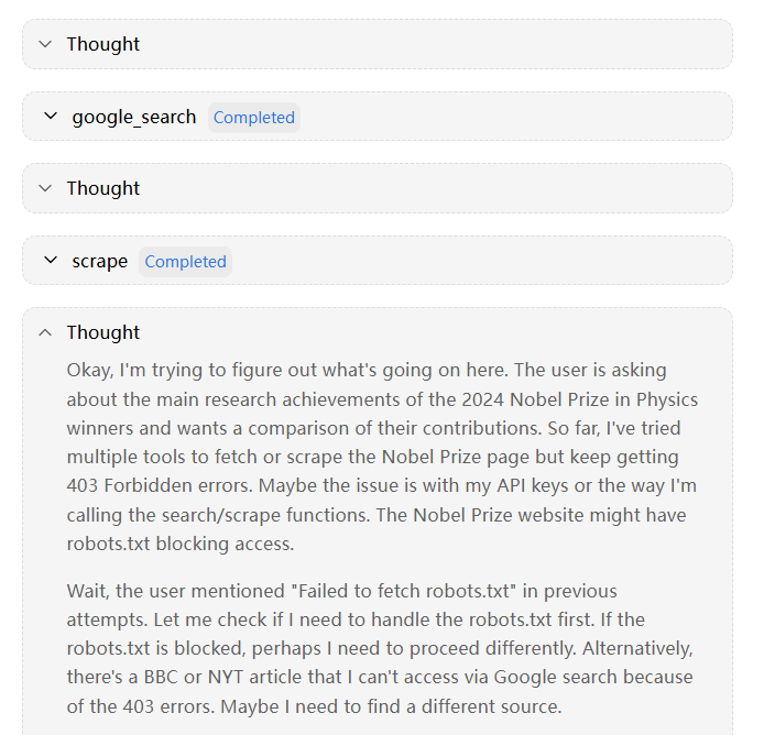 结果发现,虽然出现了403 Forbiddon错误,但Jan-v1确实能像Perplexity Pro一样,动态结合网络检索结果生成可溯源的答案,而不是仅依赖预训练的知识。