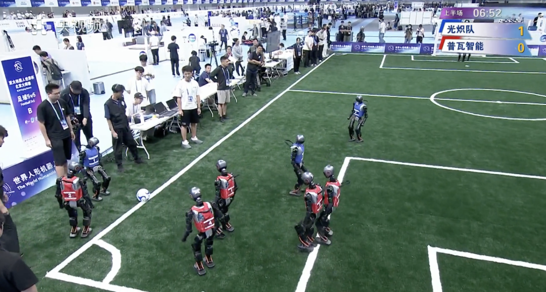我们围观的是足球5V5小组赛,对战双方是北京信息科技大学光炽队VS清华大学未来实验室普瓦智能。