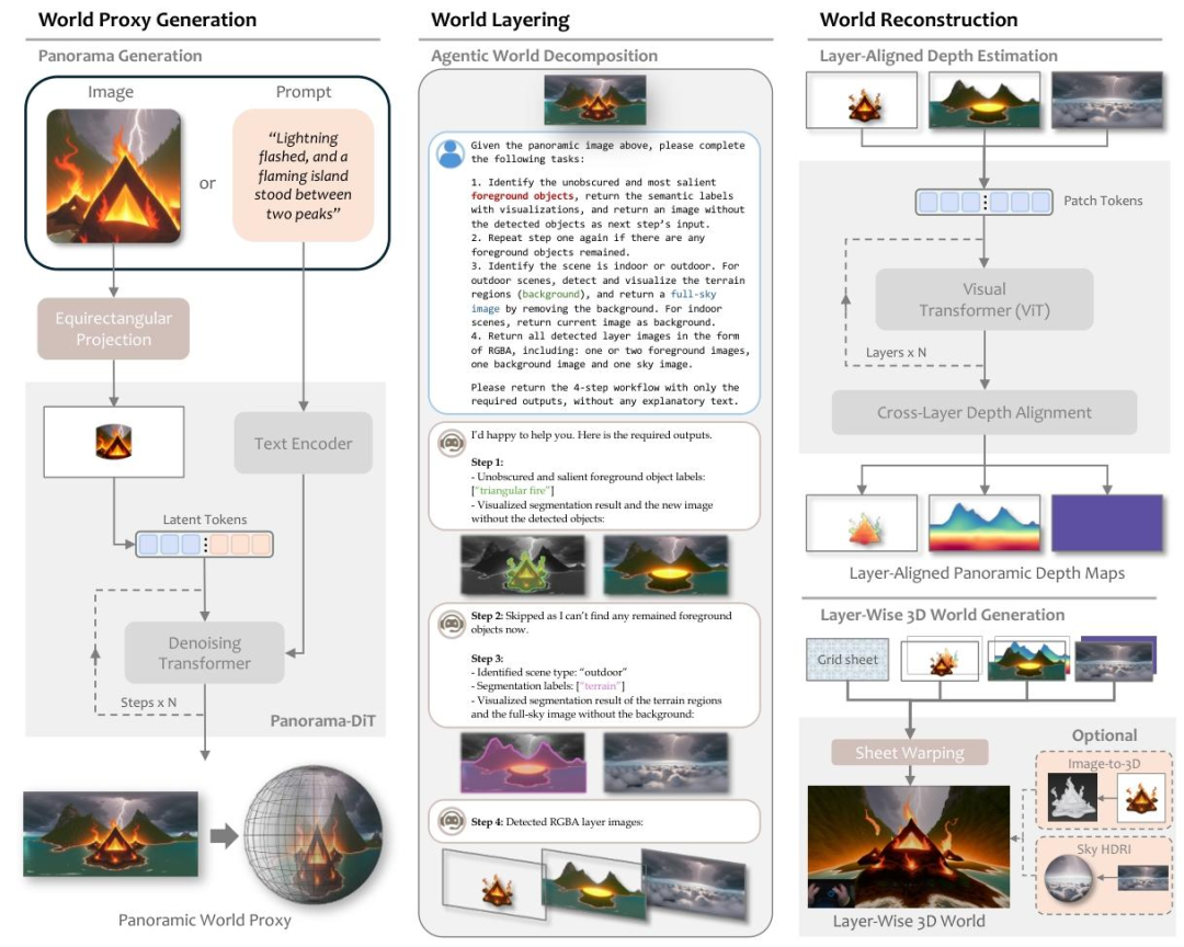 HunyuanWorld 1.0技术框架的核心是以全景图为桥梁,分层实现3D生成,通过借助2D生成技术的多样性做出丰富场景,再基于全景图实现3D生成的连贯性。