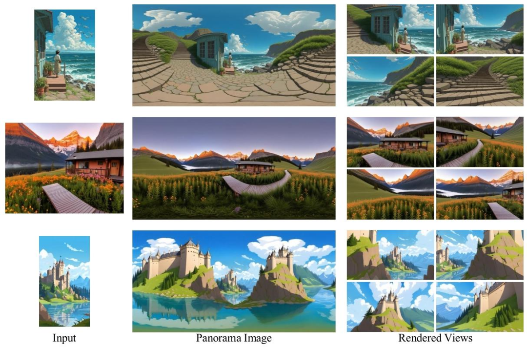 首先根据文字或图片输入,生成无边界断裂、无几何变形的360°全景图。