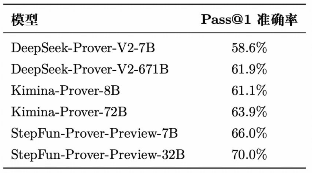StepFun-Prover-Preview-7B的pass@1通过率也已超过DeepSeek-Prover-V2-671B和Kimina-Prover-72B。