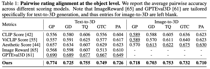 通过统一的模型设置与对比实验,Hi3DEval在人类偏好一致性上的表现优越,超越了现有主流自动评测指标,为3D内容生成领域提供了更可靠、更全面的评测工具。