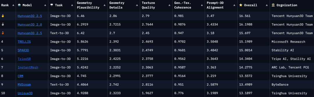 研究团队表示,该榜单可以直观呈现各模型的总和表现,希望以此为学术界与产业界提供可追踪、可复现的对标基准,推动3D生成技术向更高质量与更高透明度发展。