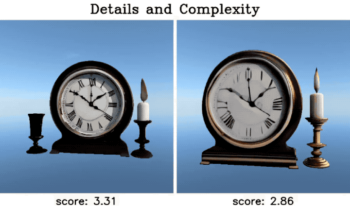 榜单在统一的评测设置下对所有模型进行测评,包括相同的输入提示、渲染视角、光照条件及输出格式。这种标准化流程不仅消除了实验环境差异带来的偏差,还保障了榜单的评分结果的公正性和可参考性。