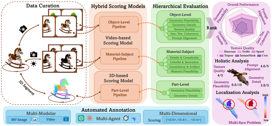 Hi3DEval基于三层评测协议的层次化评测体系,旨在提供更细粒度的质量剖析,还能揭示具体的优缺点,为模型改进与优化提供明确方向。