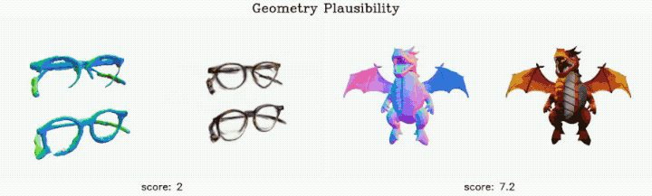 这种粒度更细的评测不仅有助于诊断生成过程中的局部几何问题,还能在模型优化时提供有针对性的改进信号。评测维度包括局部几何合理性(保证局部结构符合现实物理与设计逻辑)和局部几何精细度(衡量细节刻画的清晰度与丰富程度)。