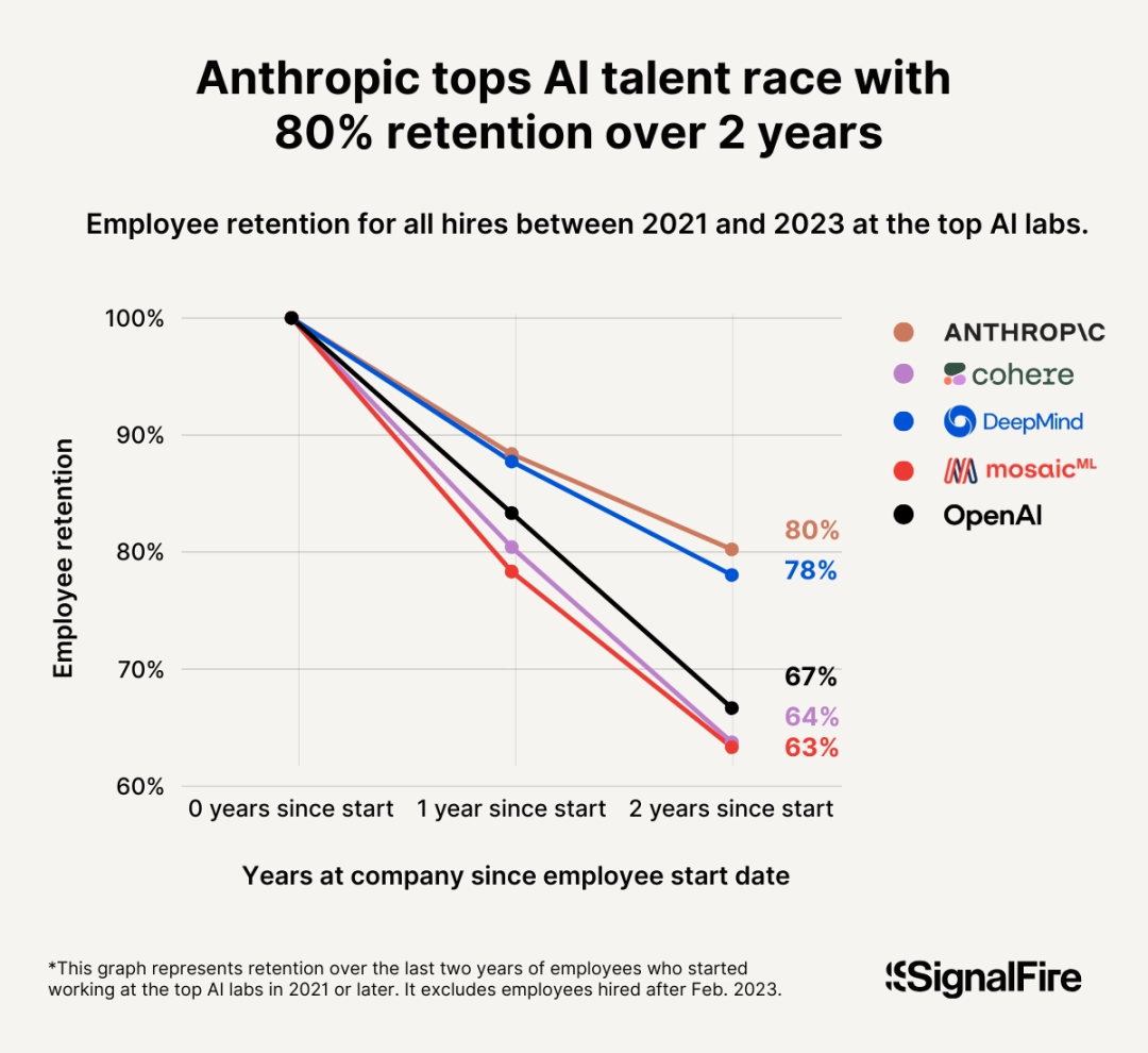 过去两年,坚持不搞天价挖人的Anthropic员工保留率高达80%,而大手笔撒钱的Meta以及OpenAI只有64%。