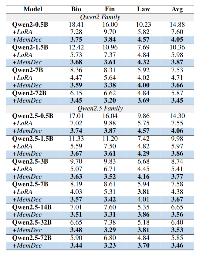 为了验证Memory Decoder的有效性,团队选用了多种Qwen(从0.5B到72B参数)和Llama系列(从1B到70B参数)的预训练语言模型,来测试其在生物医学、金融、法律这三个专业领域的效果。