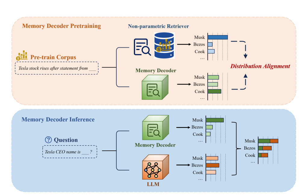 有了Memory Decoder后,由于已经在预训练中学会了模仿检索器的行为,会更倾向输出“布鲁默”的分布(如“布鲁默80%,马斯克10%,库克5%”)。
