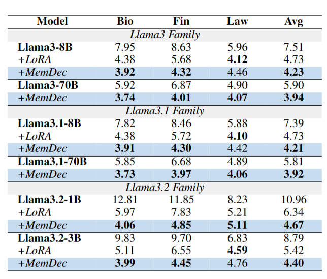 不仅显著降低了所有Llama变体模型的困惑度,而且在生物医学和金融领域的表现持续优于LoRA方法。