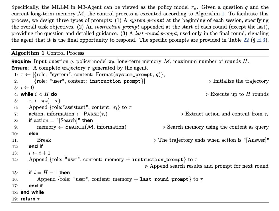 M3-Agent并非使用单轮检索增强生成(RAG)将记忆加载到上下文中,而是采用强化学习来实现多轮推理和迭代记忆检索,能自主从不同维度(如事件或角色)的长期记忆中检索相关信息,从而提高任务成功率。