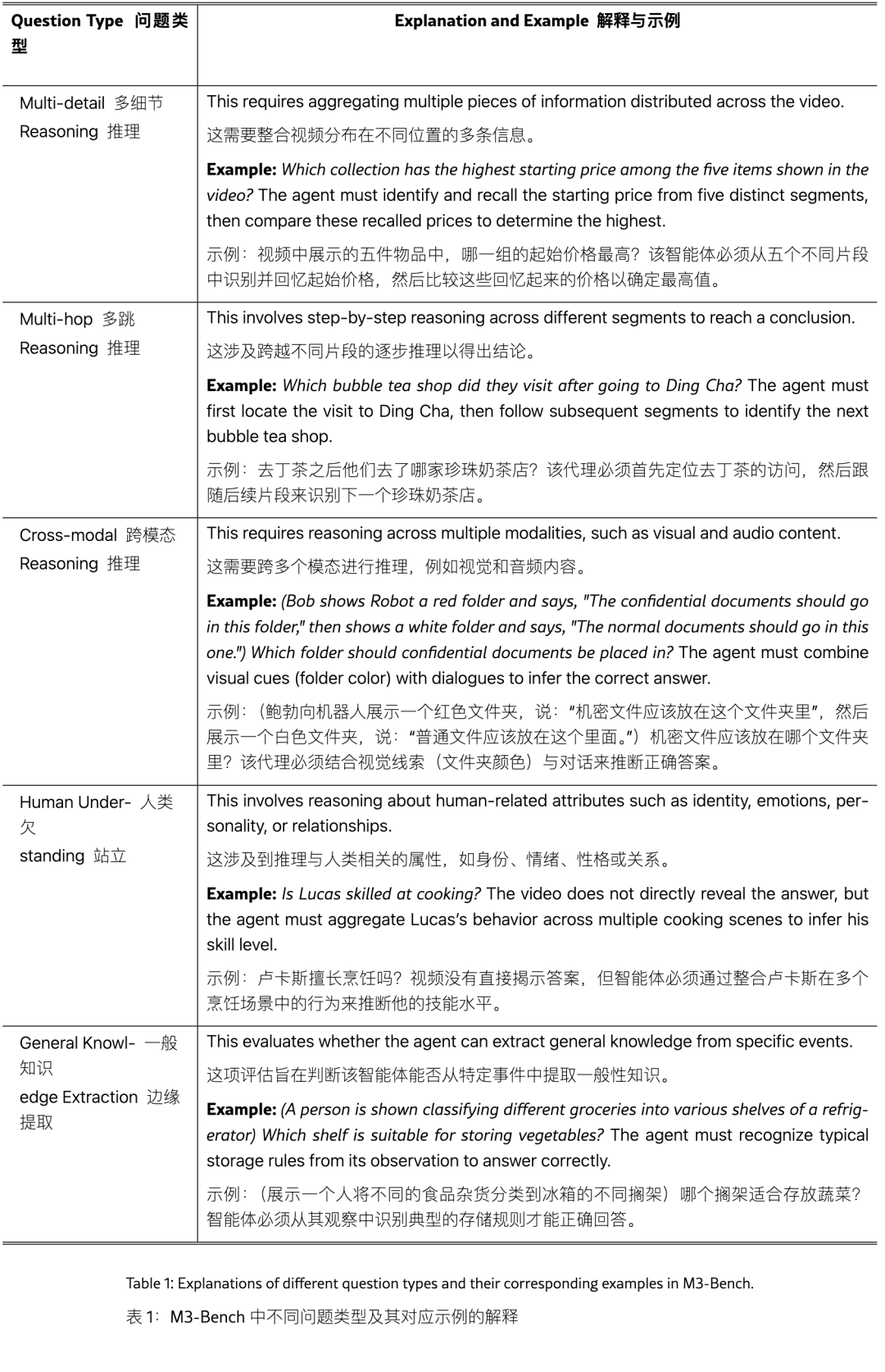 M3-Bench中的每个实例包含一个模拟智能体感知输入的长视频,以及一系列开放式问答对。