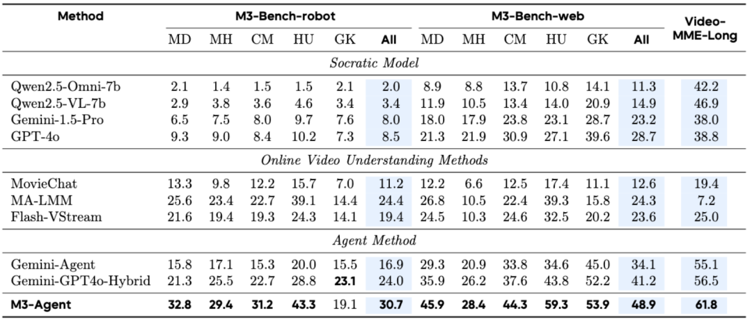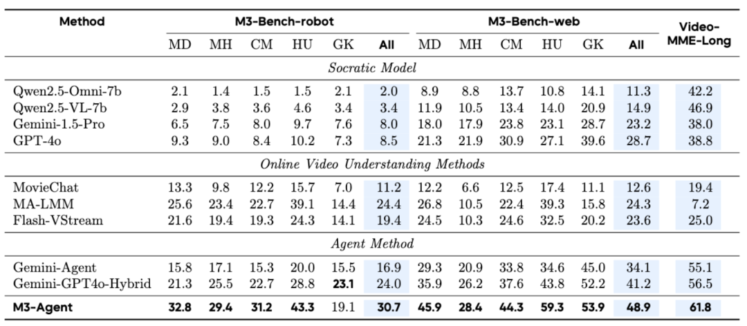 实验表明,通过强化学习训练的M3-Agent在多个基准测试中表现均显著优于基线模型(包括基于商业模型如Gemini-1.5-Pro和GPT-4o的智能体)。