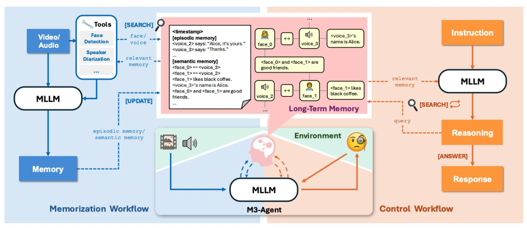 记忆过程持续感知实时多模态输入以构建和更新长期记忆;控制过程则解释外部指令,对存储的记忆进行推理,并执行相应的任务。