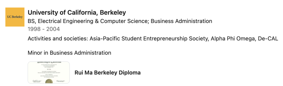 Rui Ma 2004年本科毕业于UC伯克利,在校期间主修电气工程与计算机科学,辅修工商管理。