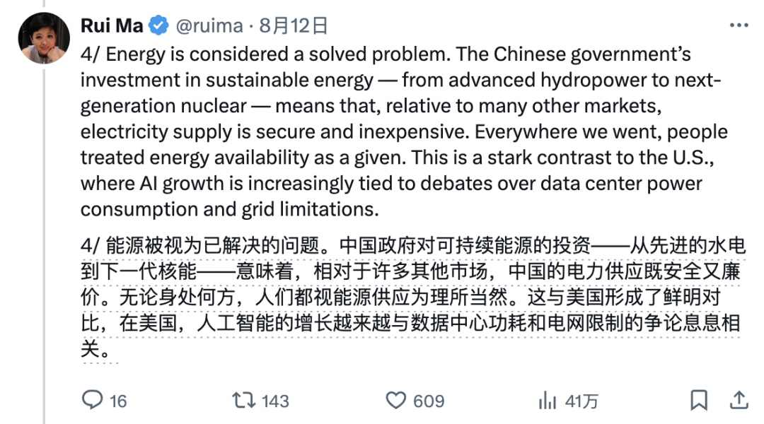 而AI竞赛的尽头是电力,恰恰就是电力,所以马睿认为,在AI竞速当中,美国要落后了。