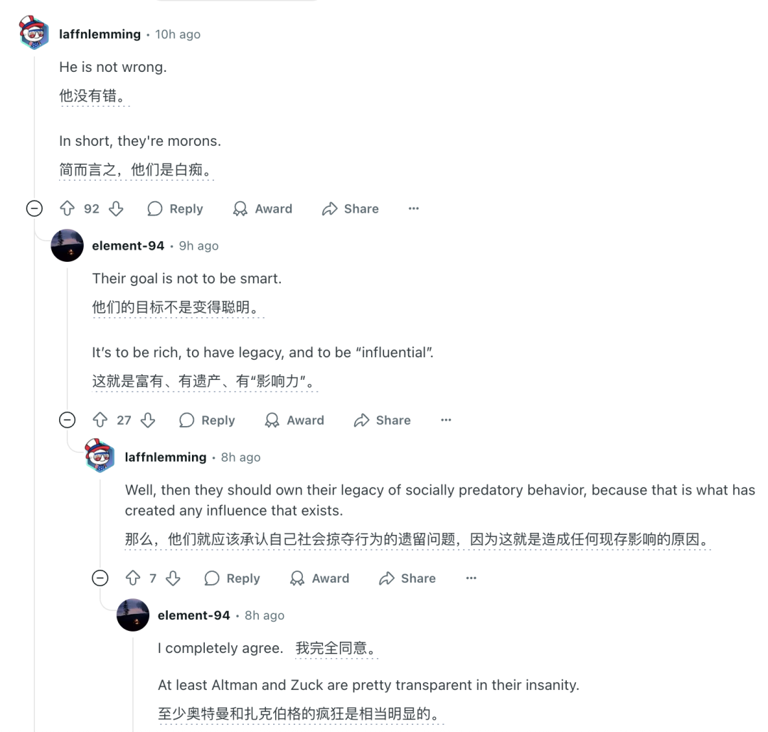 有网友表示,自己完全赞同Hinton的观点,并痛骂那些科技企业都是白痴,回复中也有网友表示认同,并特意点名奥特曼和扎克伯格。