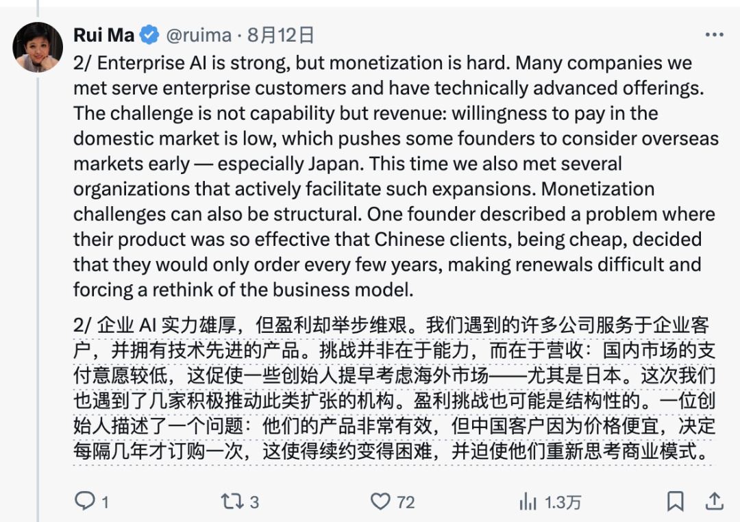 Rui Ma表示,中国AI企业实力雄厚,但由于产品和服务定价较低,实现盈利比较困难。
