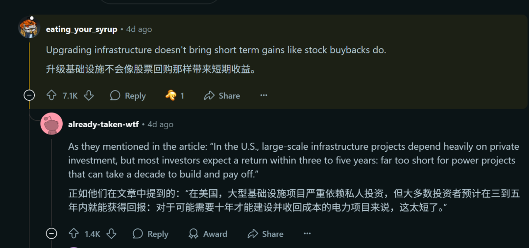 而公司往往都更注重个人利益,短视也是在所难免的(doge)。连美国网友也承认这一点,“升级基础设施不会像股票回购那样带来快速短期收益”。