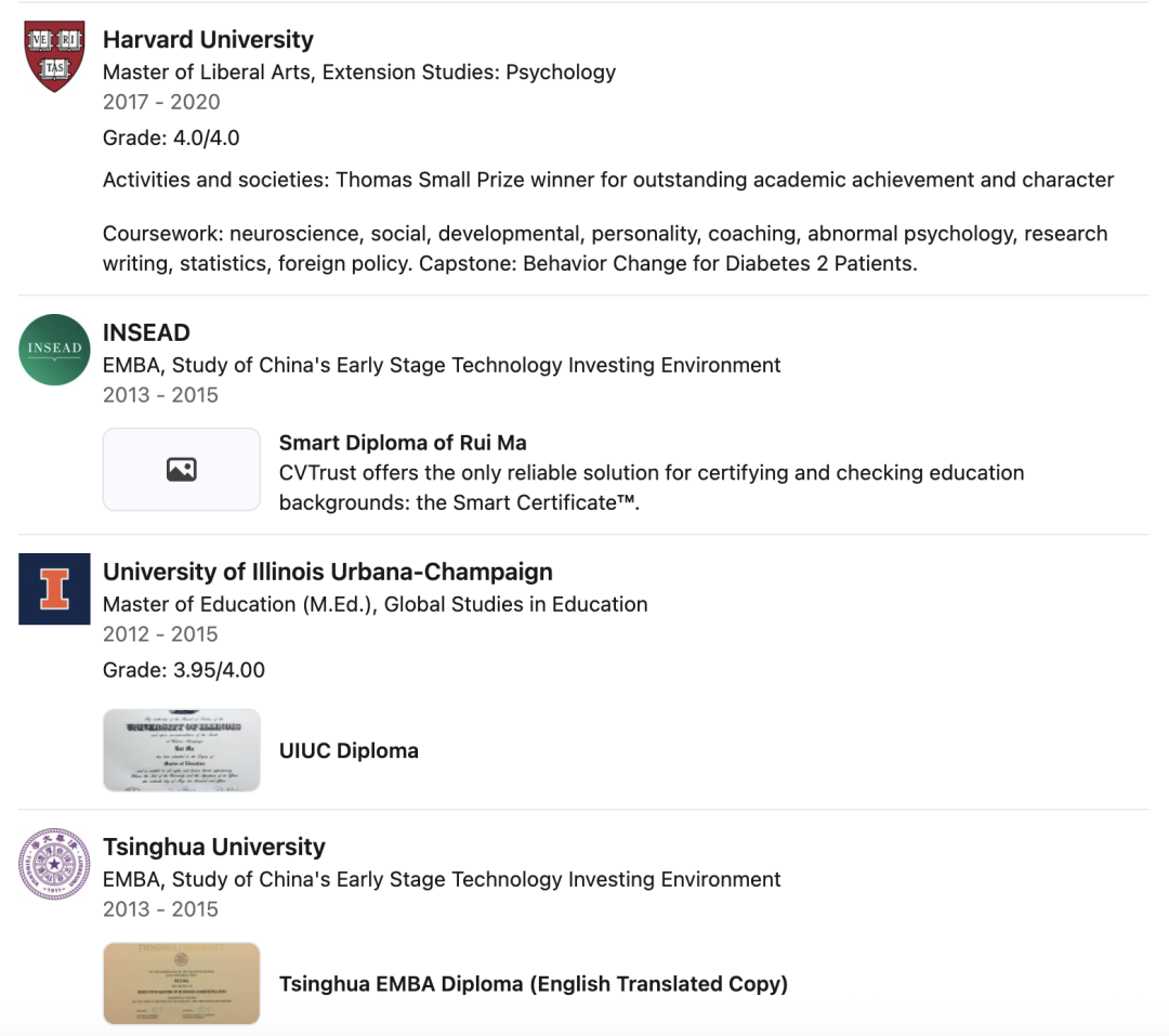 之后的十余年当中,她先后获得了4个硕士学位,包括清华和欧洲商学院的两个EMBA、伊利诺伊大学香槟分校的教育学学位和哈佛的心理学学位。