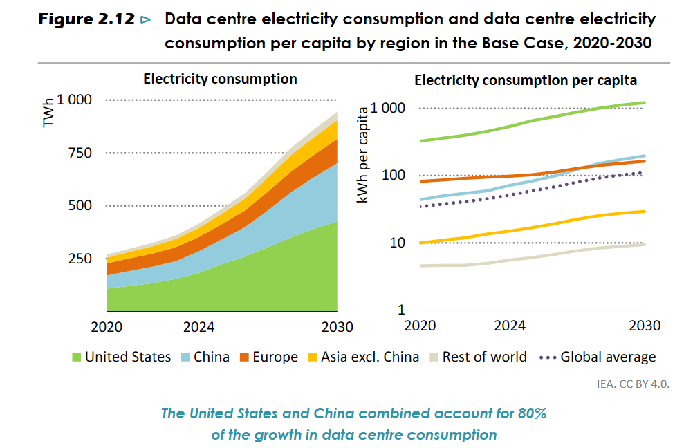 根据国际能源署发布的2025《能源与人工智能》报告,预计在未来几年,中美两国将是数据中心电力需求最大的国家,而且两国将是数据中心电力消耗增长最重要的地区,合计占到2030年全球增长的近80%。