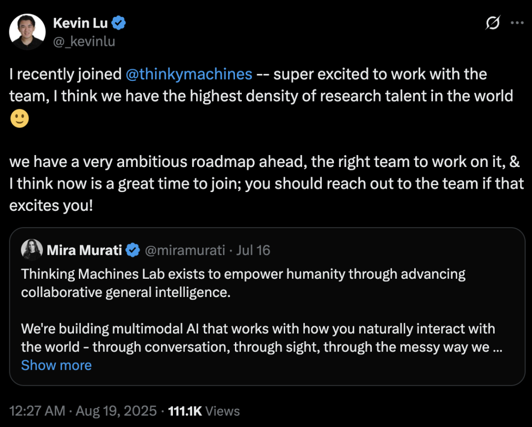 Kevin Lu的下一站Thinking Machine Lab,也是AI领域近期讨论度最高的初创公司之一。