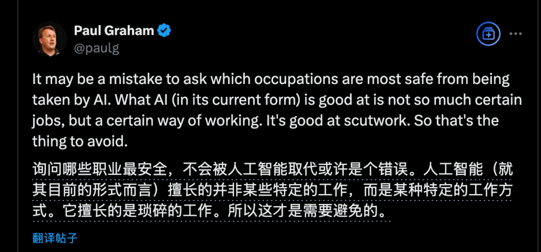 Y Combinator创始人Paul Graham在帖子中也表达了类似观点,他说低级别的编程工作已经在消失,因为AI擅长做杂活。