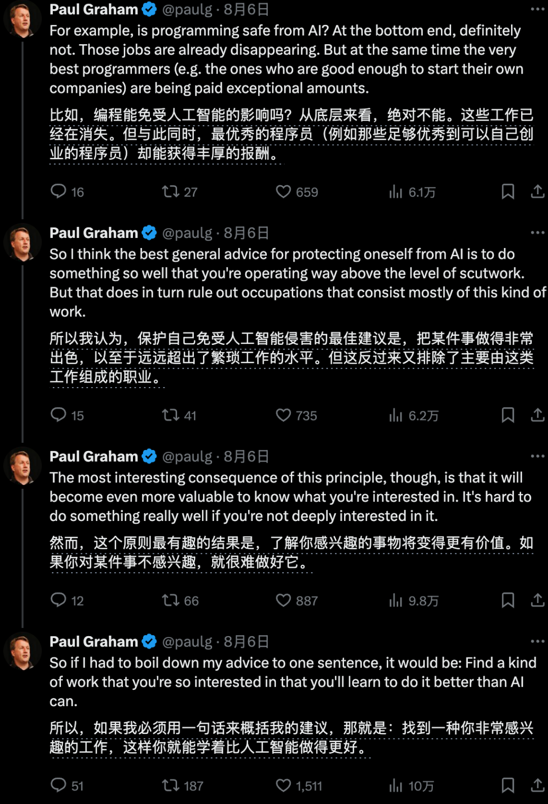 所以我认为保护自己免受AI影响的最佳通用建议是,把某件事做得非常好,让你的操作水平远远高于杂活的水平。如果你对某件事没有深厚的兴趣,就很难把它做得非常好。