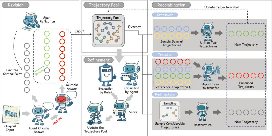 它不再满足于简单地“多想几次”,而是让智能体学会系统性地修订、重组与精炼其整个思考过程,通过多轨迹间的相互启发与对抗,探索更广阔、更多样化的解决方案空间。