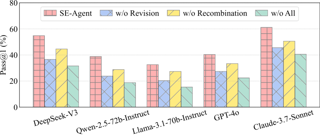 4、模型无关的即插即用:SE-Agent作为一个独立的优化模块,可与现有智能体框架无缝集成,在多种 LLM 上都展现出一致的、强大的性能提升。