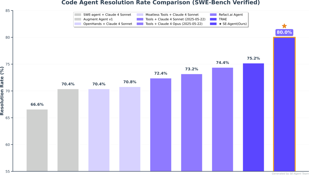 随着Claude 4模型的发布,SE-Agent的性能被推向新的高度:在SWE-Bench Verify上,它取得了高达80%的Top-1 Resolution Rate,再次刷新了领域纪录。