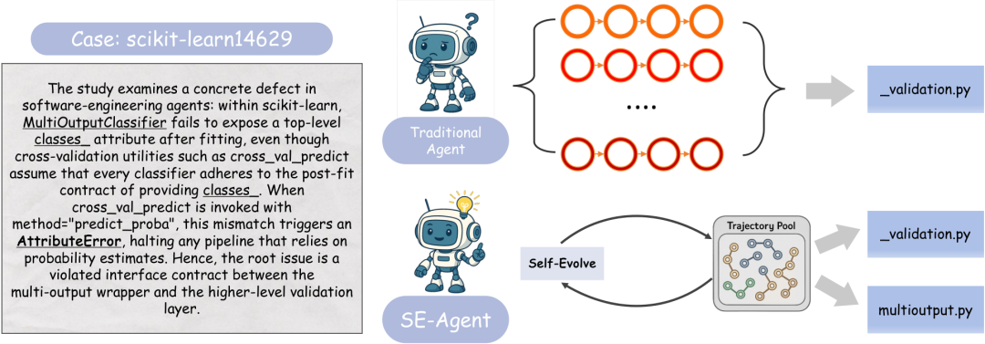 SE-Agent(下图):通过轨迹的重组与进化,SE-Agent强迫自己探索了完全不同的方向。它跳出了最初报错的文件,成功定位到根源在于multioutput.py文件缺少了一个关键字段的写入。最终,通过一行代码的根本性修复,完美通过了所有测试。