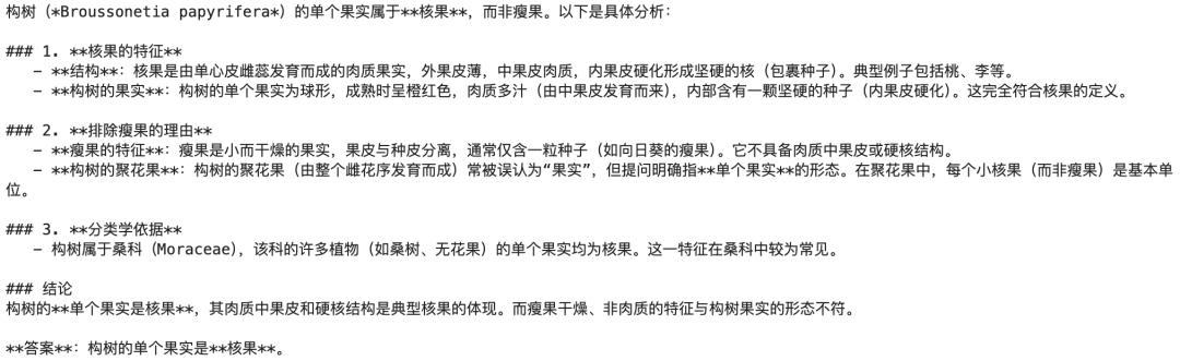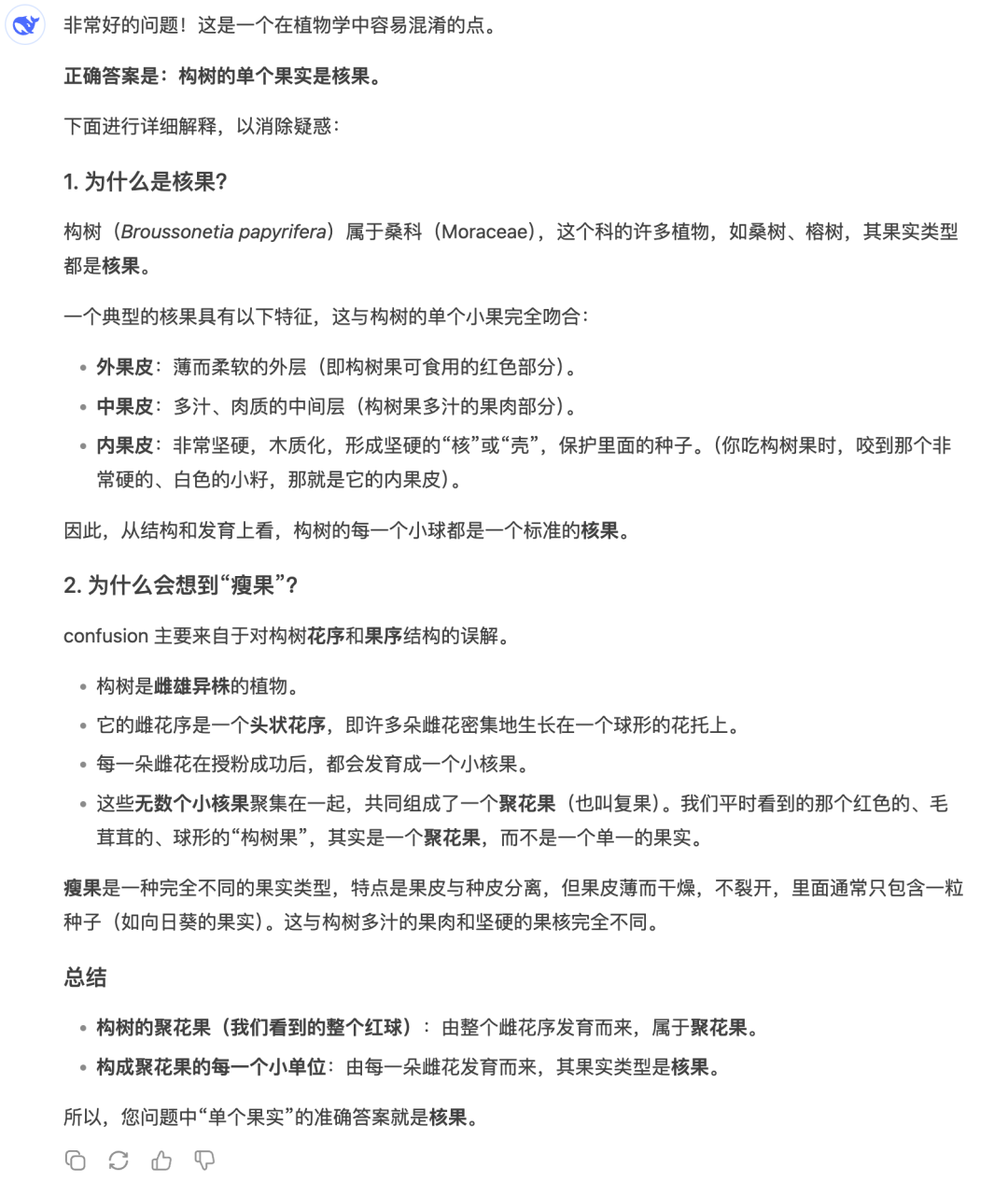 神奇的是V3.1依然存在使用conclusion替代“结论”这样的表述,以及对于“为什么会想到瘦果”这个问题的回答偏题到该果实属于聚花果的方向了。