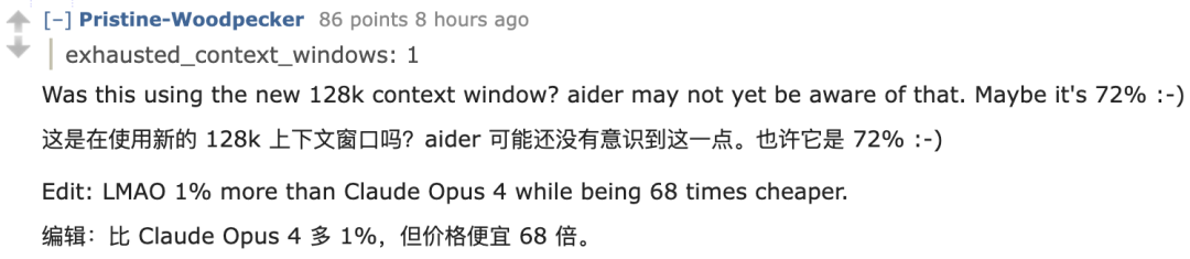 这是什么概念——有网友解释到,这意味着它比Claude Opus 4得分多1%,但价格便宜68倍。
