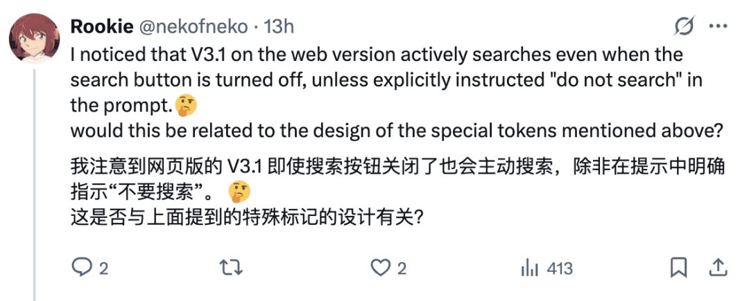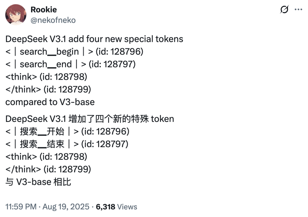 有网友察觉到它增加了四个特殊的token,并注意到现版本的V3.1在关闭搜索状态下也会自动搜索。