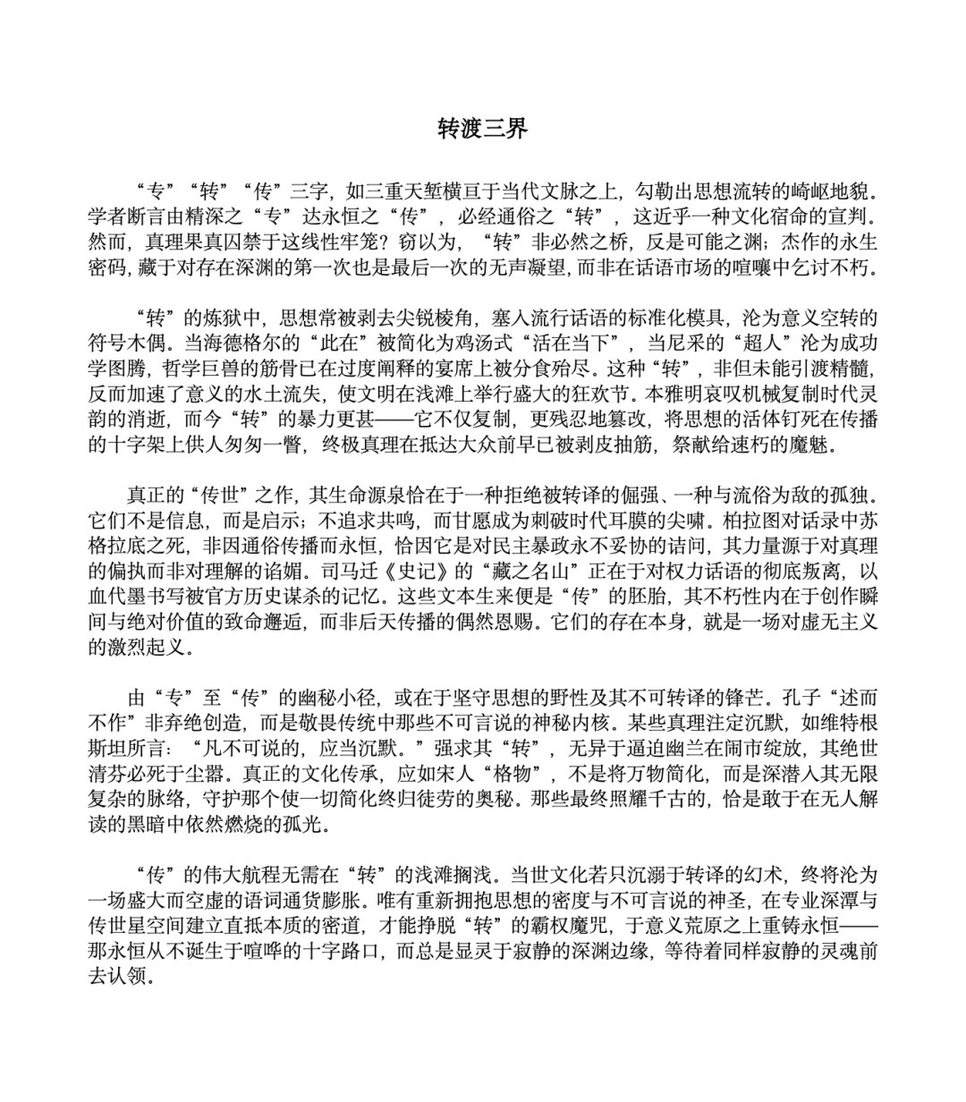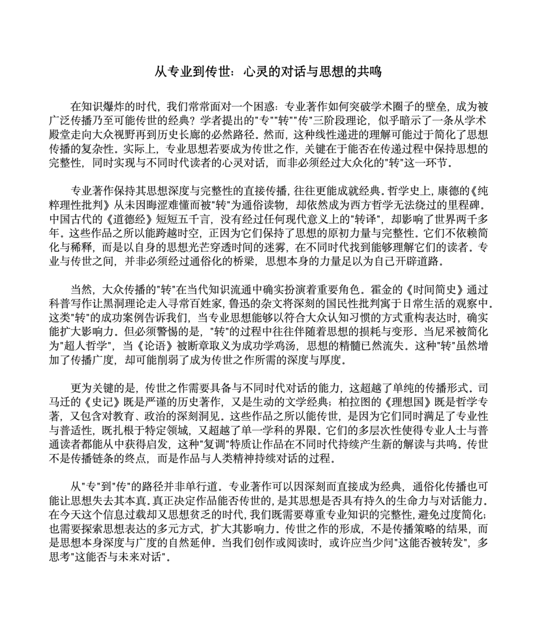有学者用“专”“转”“传”概括当下三类文章:“专”指专业文章;“转”指被转发的通俗文章;“传”指获得广泛传播的佳作,甚至是传世文章。他提出,专业文章可以变成被转发的通俗文章,而面对大量“转”文,读者又不免期待可传世的文章。由“专”到“传”,必定要经过“转”吗?请联系社会生活,写一篇文章,谈谈你的认识与思考。要求:(1)自拟题目;(2)不少于800字。