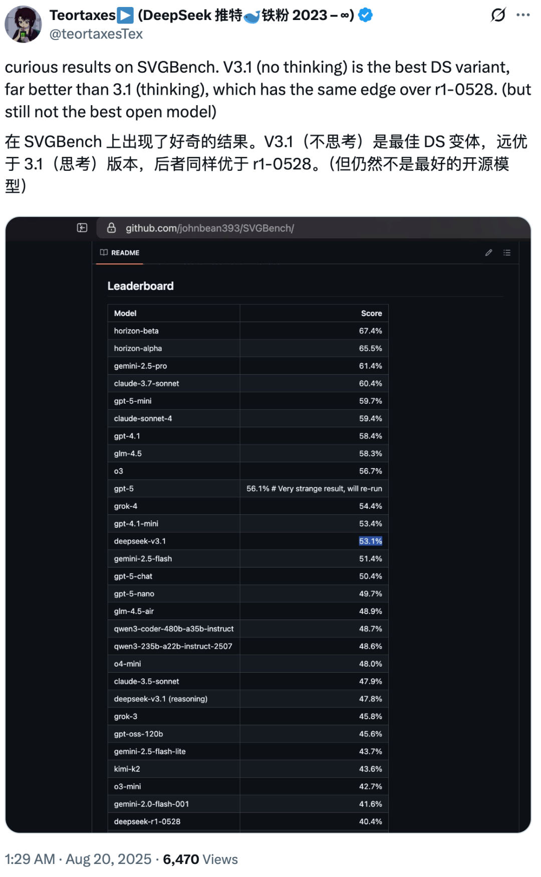 也有人在SVGBench基准上发现:V3.1的表现>V3.1(思考)>R1 0528。