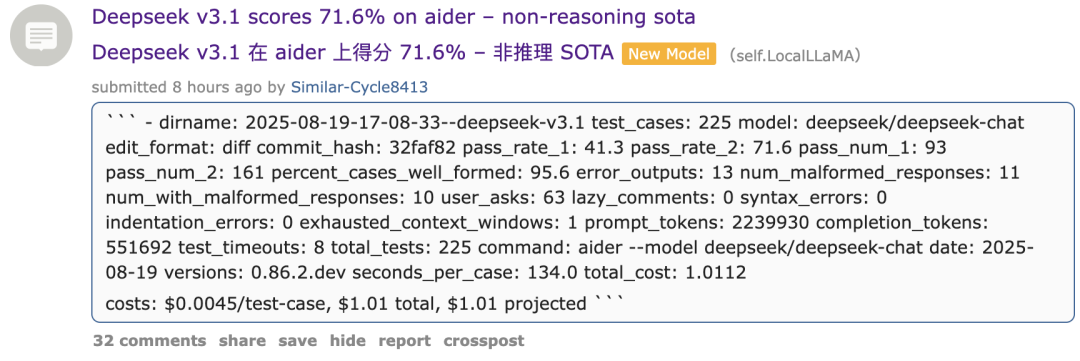Reddit就有人测试,DeepSeek V3.1在aider上得分71.6%,拿下了非推理模型的SOTA。