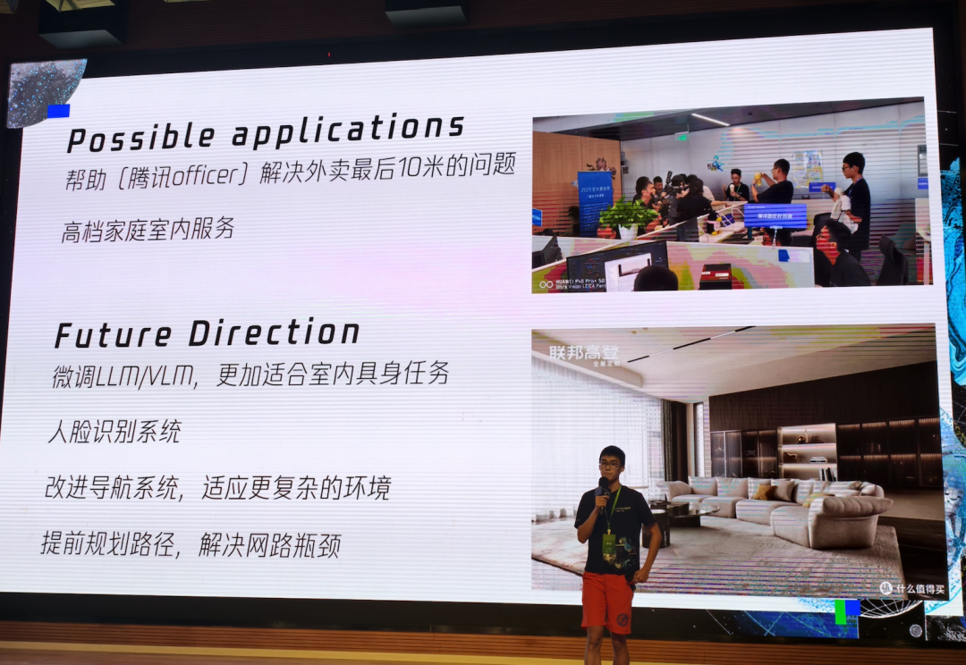 接下来,他们计划进一步微调LLM、增加人脸识别系统、优化导航等方向进行改进。这个项目的潜在应用是解决办公室外卖“最后十米”的问题,还有像高档酒店的室内服务。