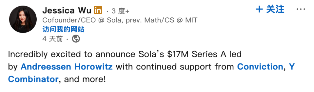 华人女生Jessica Wu的初创公司Sola Solutions最近在创投圈风头正盛,连续拿下a16z和Conviction分别领投的两轮投资,总融资额高达1.5亿。