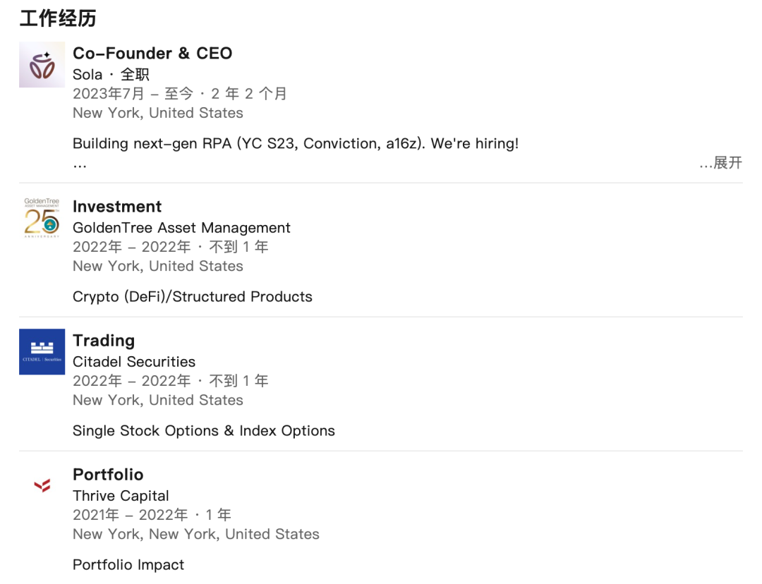 曾在金融领域(如Citadel Securities、Goldentree AM、Thrive Capital等对冲基金)从事风险投资、量化研究和交易工作,在一家价值数十亿美元的对冲基金中做到了最年轻的量化研究员。