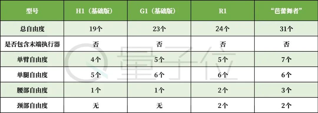 整理后可以看到,“芭蕾舞者”的自由度是宇树目前四款人形机器人(基础版)里最多的。