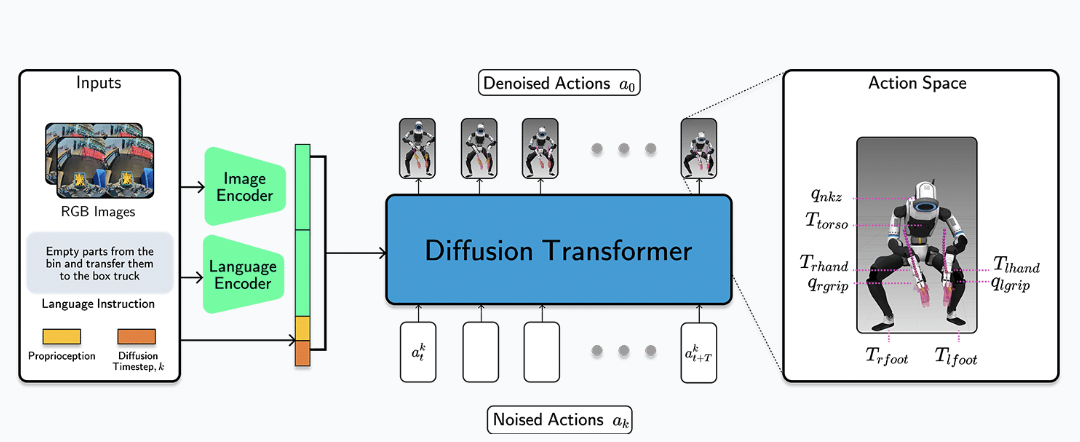 更值得关注的是,此次大型行为模型采用4.5亿参数的扩散Transformer模型,并结合流匹配目标,能将包括30Hz图像、人体感觉和自然语言指令等输入信息转化为控制Atlas活动的动作指令。