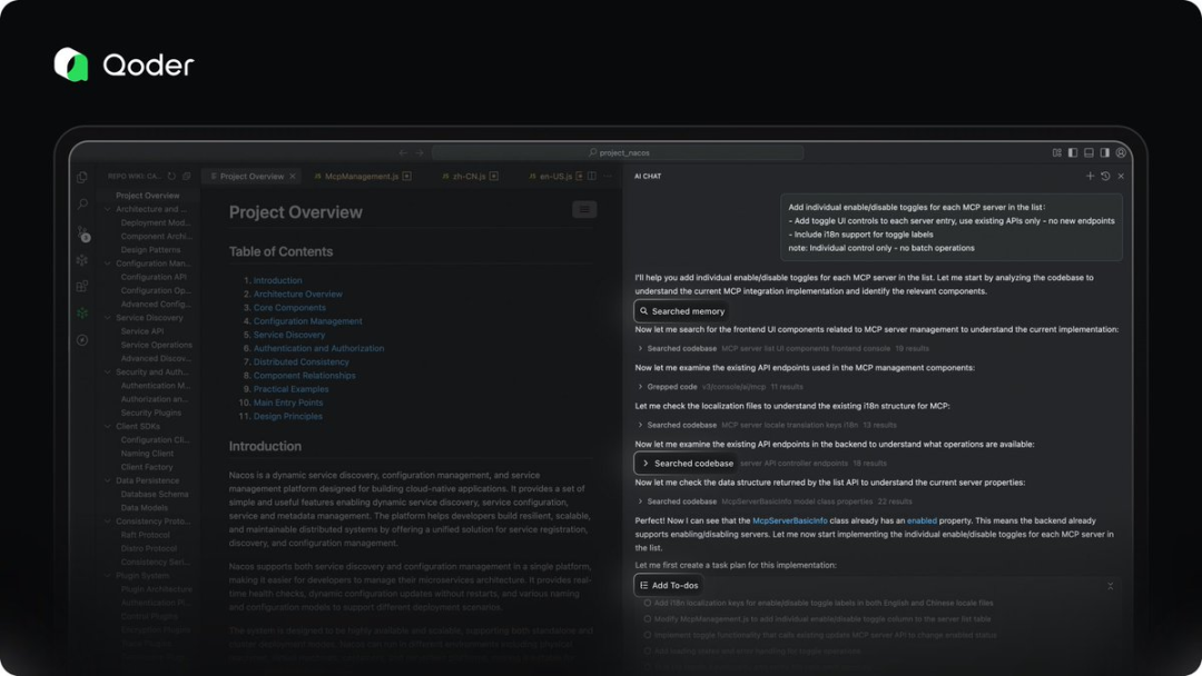首先,Qoder 能够深度分析用户的代码库,并将其隐藏的结构、设计和逻辑自动生成一份清晰的、人人都能看懂的文档(就像项目的维基百科)。