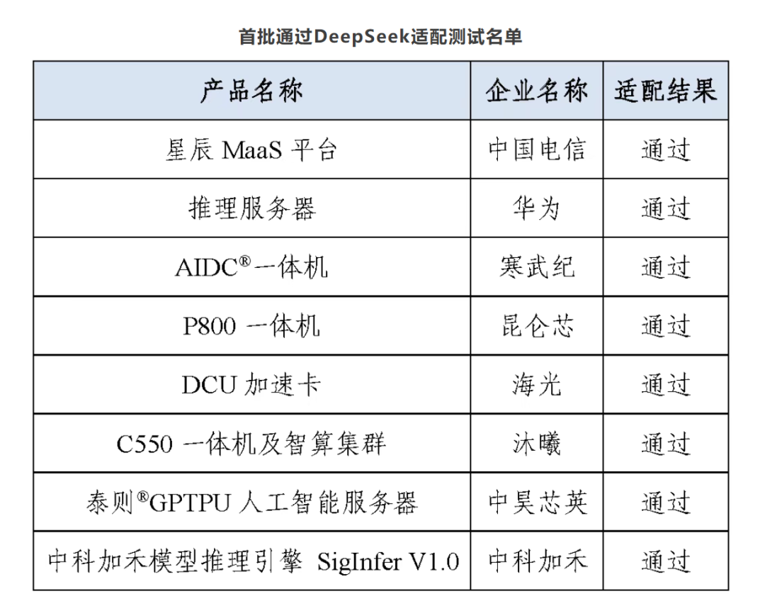 在官方有意卖关子的情况下,人们只好首先把目光放在了首批通过“DeepSeek大模型适配”的8家厂商。