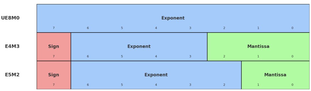 E和M则分别表示指数位和尾数位分配到的bit数,E8M0指的就是8个bit全都分配给了指数位。