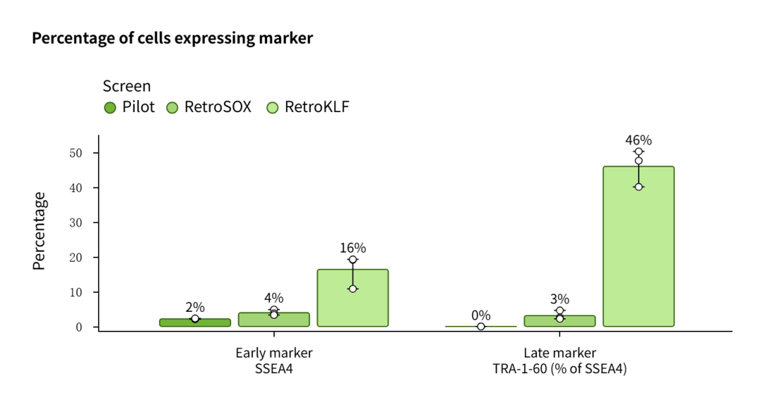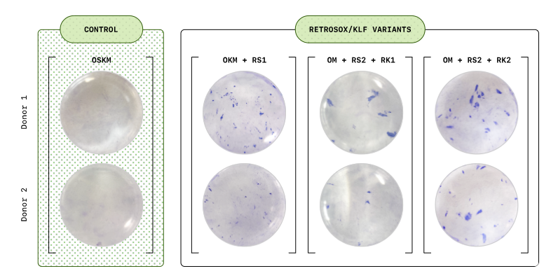 Retro团队利用人类成纤维细胞(皮肤与结缔组织)构建了湿实验室筛选平台,在初步验证阶段,该团队通过手动设计的基准OSKM和SOX2变体进行试点筛选。