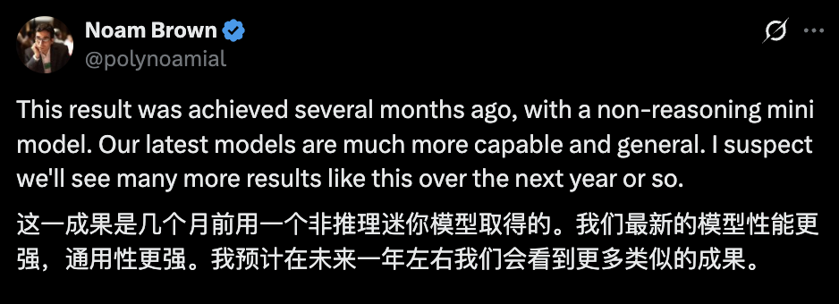 值得一提的是,OpenAI科学家Noam Brown表示,这一模型已经是几个月前的成果,现在的模型性能更强,预计未来一年左右会看到更多新成果。