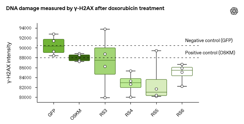 研究团队试图验证重新设计的变体是否相较于基准OSKM组合展现出更强的恢复青春的能力。结果显示,在DNA损伤检测中,经RetroSOX/KLF组合处理的细胞显示出的γ-H2AX强度(双链断裂标志物)显著低于使用标准OSKM或荧光对照的重编程细胞。